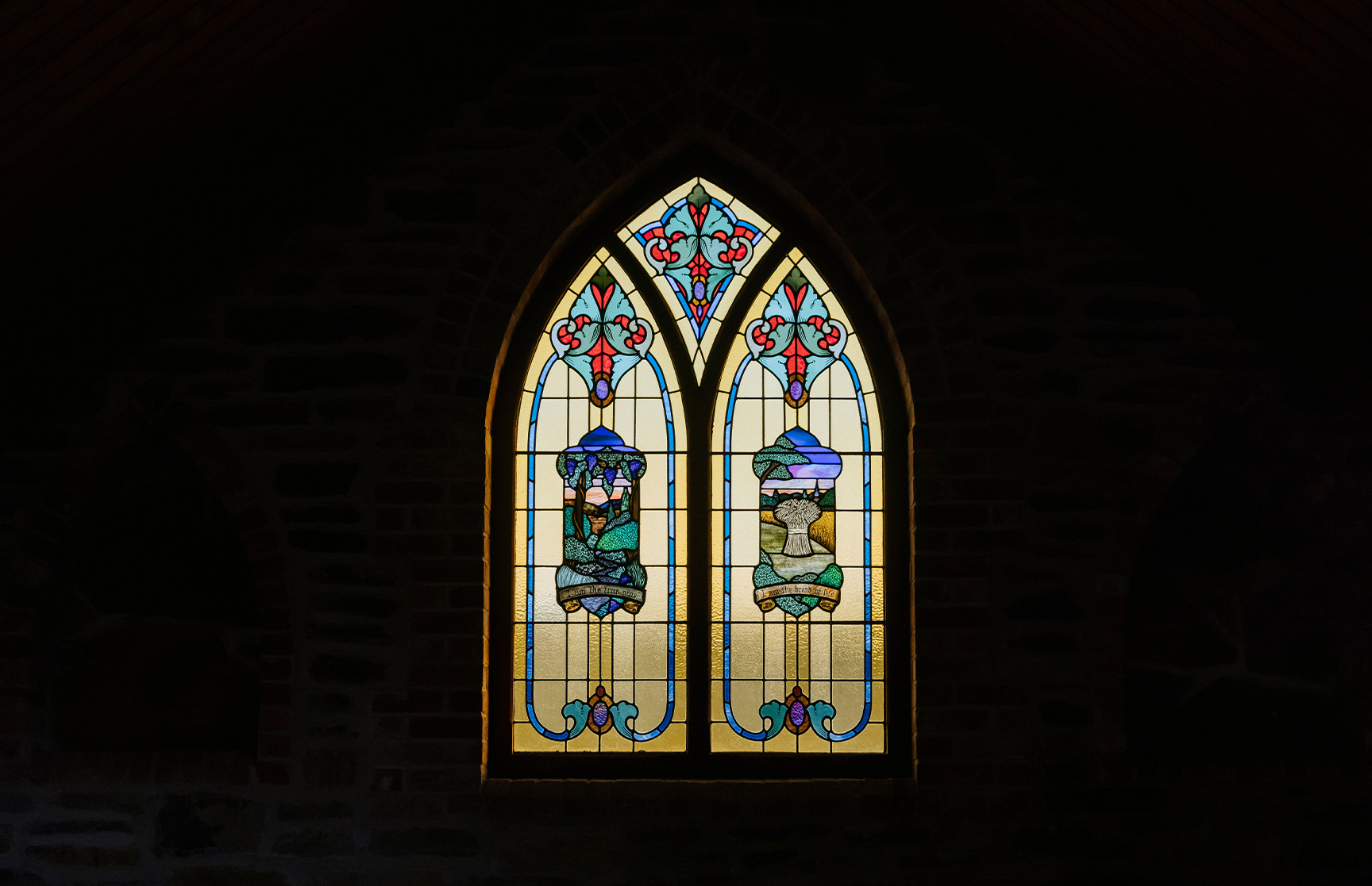 Looking through Chapel Hill's Cellar Door, across tables set for wine tasting, to the distinct arched stained glass window